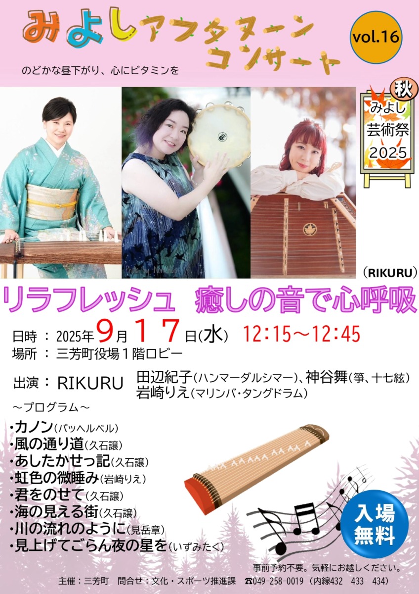 内容 リラフレッシュ 癒しの音で心呼吸 出演 RIKURU : (ハンマーダルシマー、箏、十七絃、マリンバ・タングドラム)