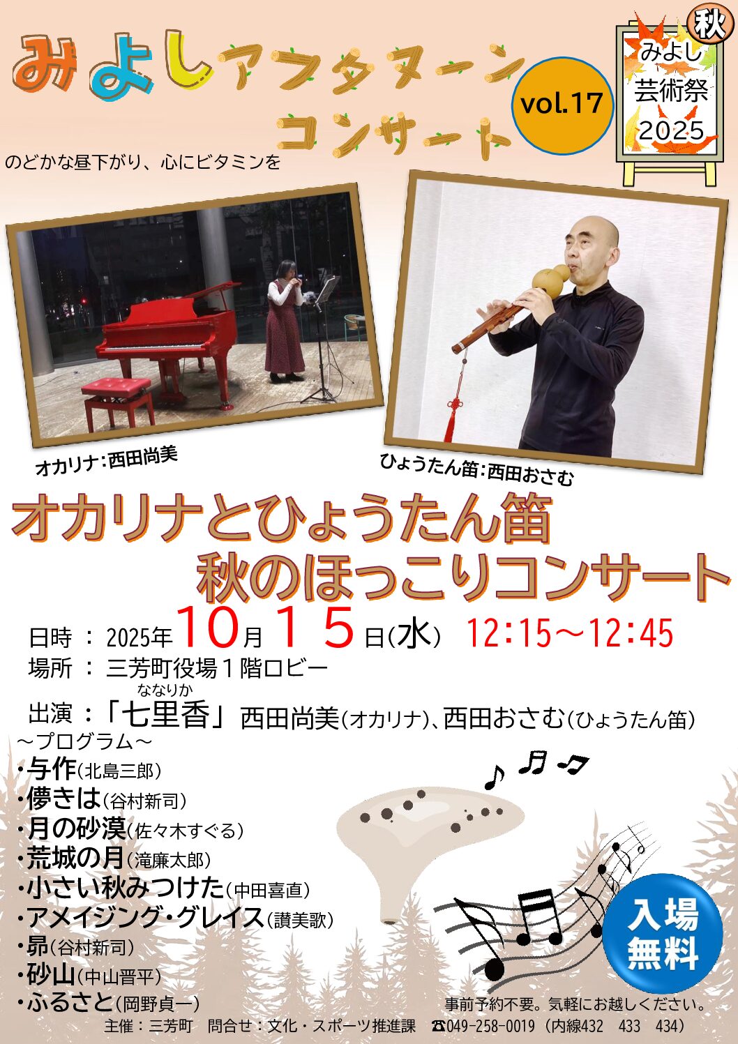 | 内容 | オカリナとひょうたん笛 秋のほっこりコンサート | ||