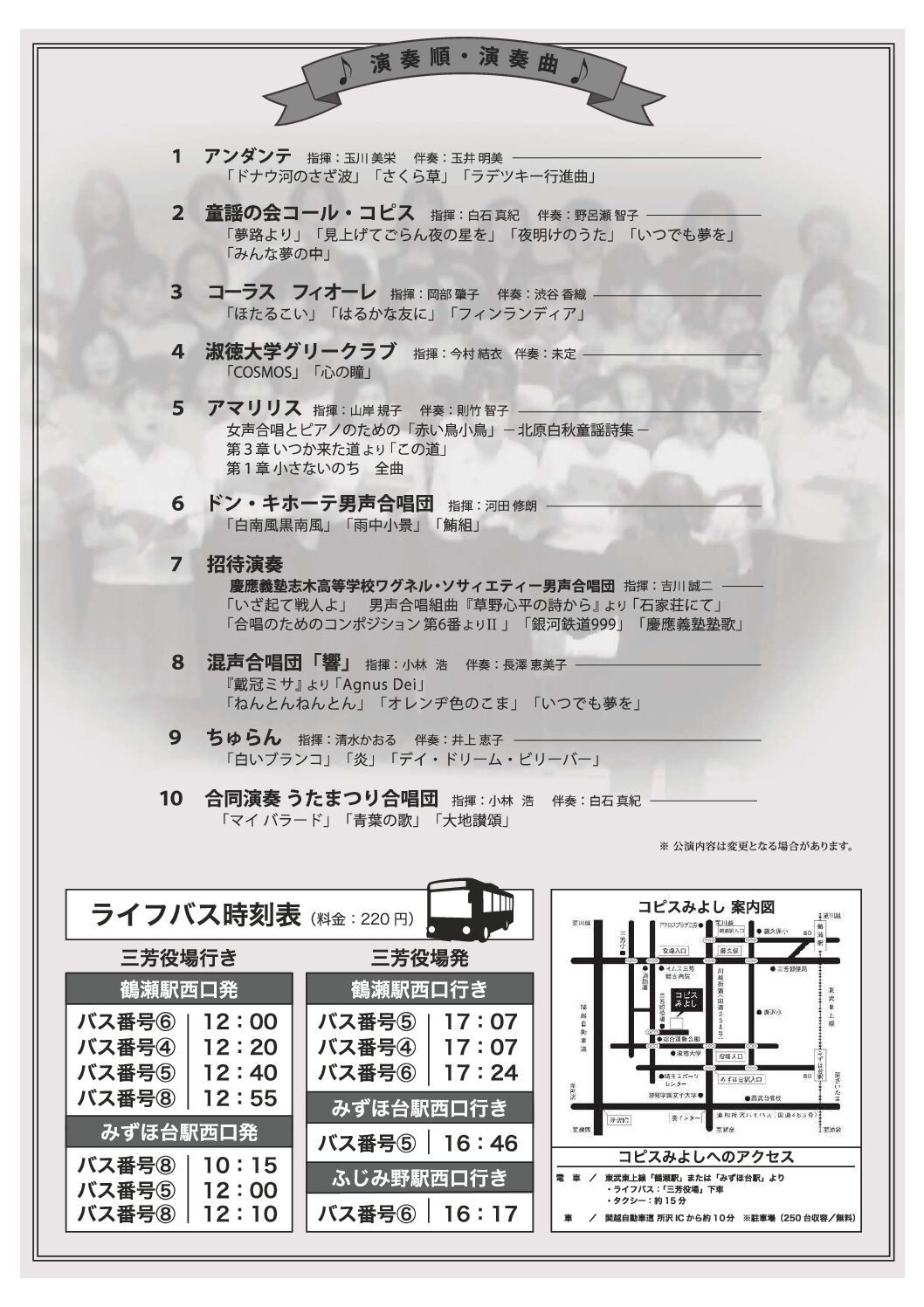 【参加団体】アマリリス、アンダンテ、コーラスフィオーレ、混声合唱団「響」、淑徳大学グリークラブ、ちゅらん、童謡の会コール・コピス、ドン・キホーテ男声合唱団、うたまつり合唱団(合唱団有志・一般公募出演者合同) 【招待演奏】慶應義塾志木高等学校 ワグネル・ソサィエティー男声合唱団 |