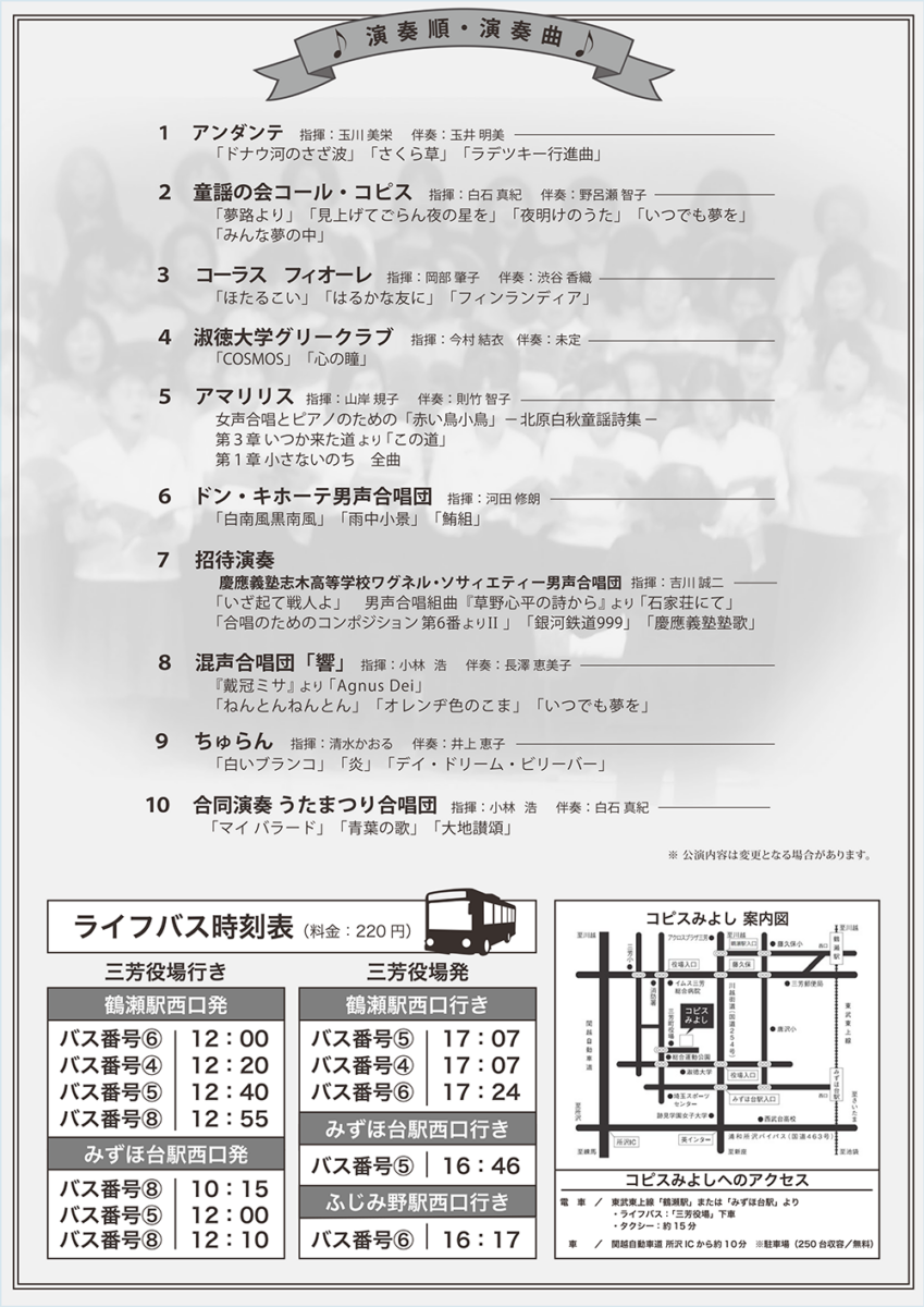 内容 三芳町や近隣地域で活動している合唱団が一堂に会する合唱祭 出演 【参加団体】アマリリス、アンダンテ、コーラス フィオーレ、混声合唱団「響」、淑徳大学グリークラブ、ちゅらん、童謡の会コール・コピス、ドン・キホーテ男声合唱団、うたまつり合唱団(合唱団有志・一般公募出演者合同)