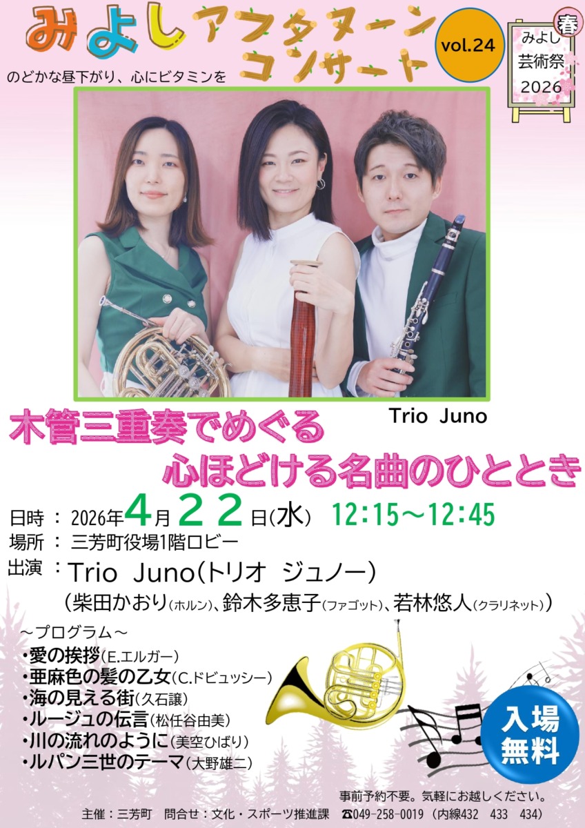 内容 木管三重奏でめぐる心ほどける名曲のひととき 出演 Trio Juno(トリオ ジュノー)